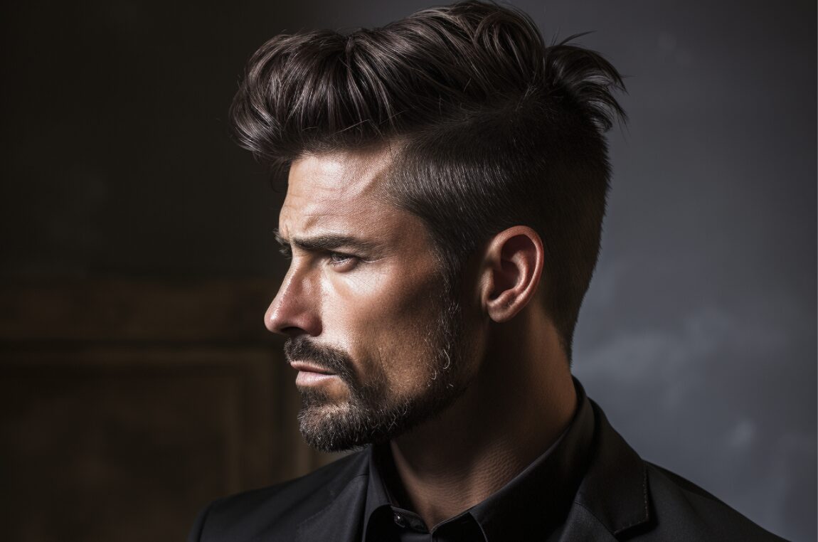 Die Pompadour-Frisur zeichnet sich durch einen voluminösen Haarschopf aus, der nach oben und hinten gestylt wird, während die Seiten kürzer gehalten werden.